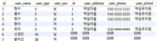 결과 사진을 보면 a_table이 기준 테이블이므로 b_table과 같지 않은 값들 또는 없는 값들은 null값으로 나온다.
