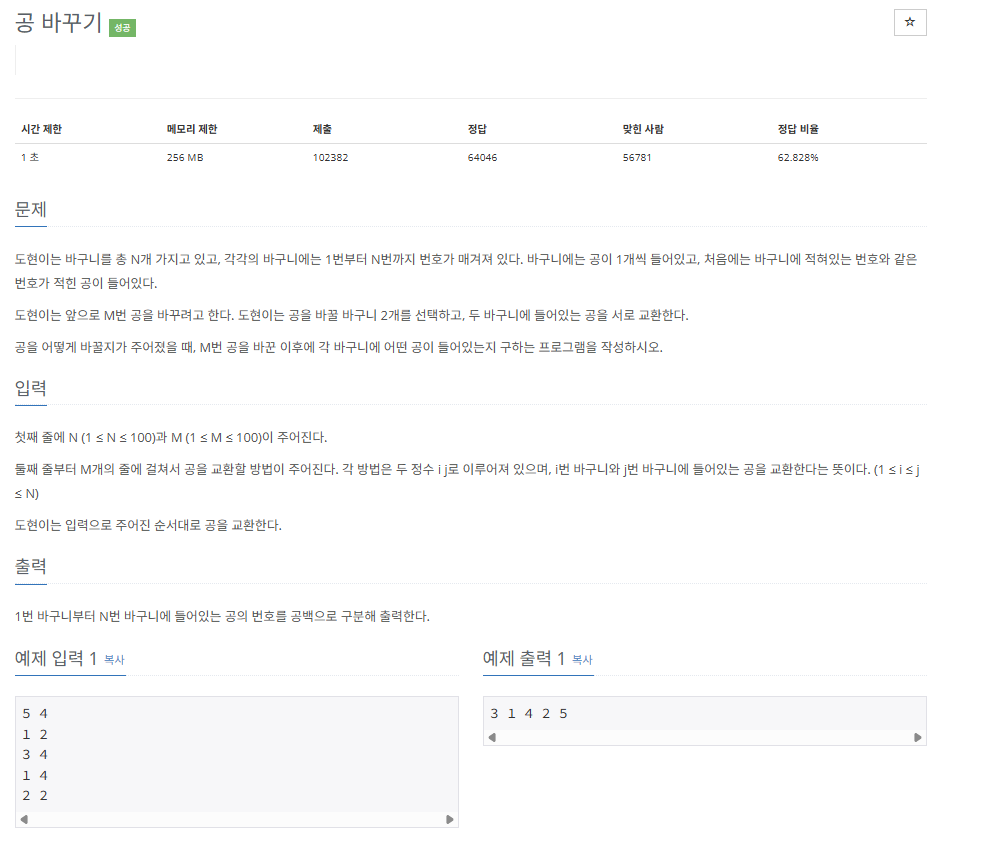 그리고 입력하는 i번 바구니와 j번 바구니(공 번호) 공을 교환해서 출력하는 거다. 그럼 바로 문제 풀이 해보겠다.