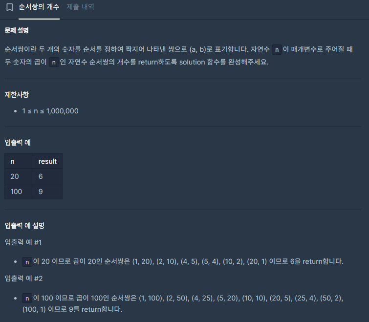 이번 문제는 프로그래머스 "순서쌍의 개수" 문제다.