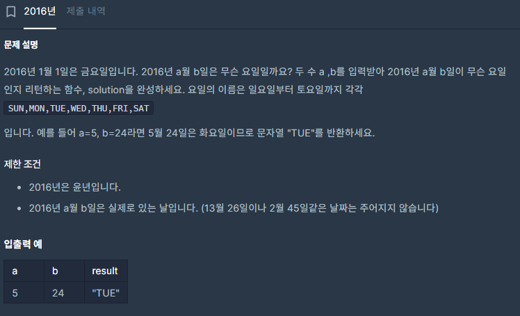 이번 문제는 프로그래머스 "2016년" 문제다.