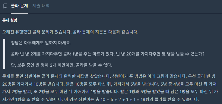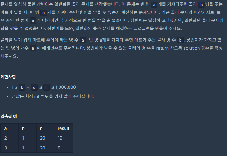 이번 문제는 프로그래머스 "콜라문제" 문제다.
