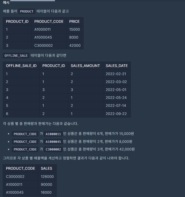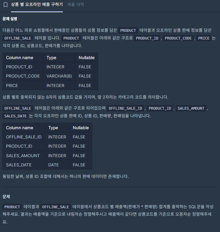 오늘 문제는 프로그래머스 "상품 별 오프라인 매출 구하기" MySQL 문제다.