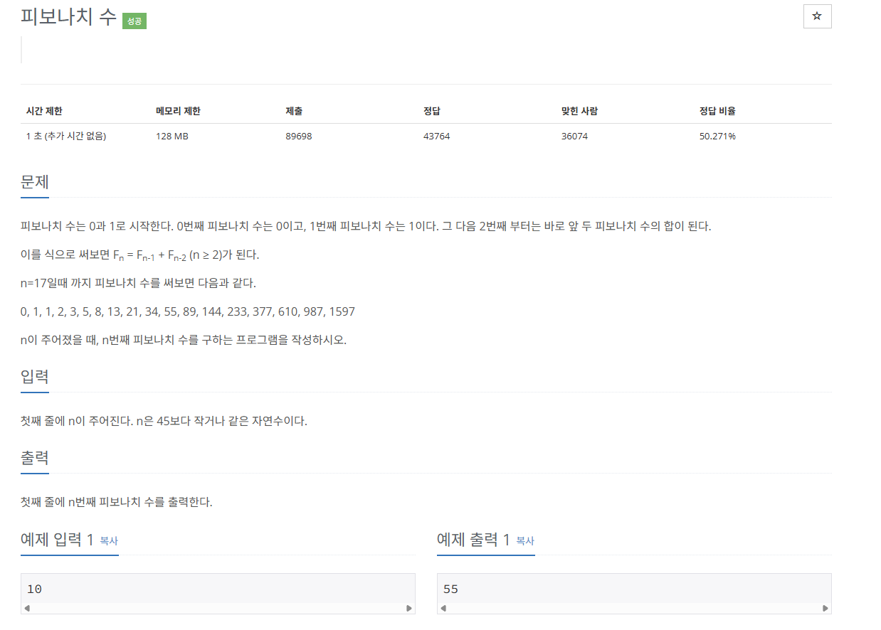 (이미 문제 설명에도 0,1,1,2,3,5,8,13,21~~ 순이고 2번째 값부터는 바로 앞 두 피보나치 수의 합이다.)