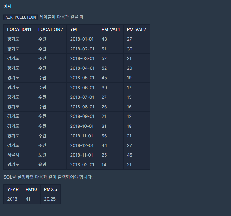 이번 문제는 프로그래머스 "연도 별 평균 미세먼지 농도 조회하기" MySQL 문제다.