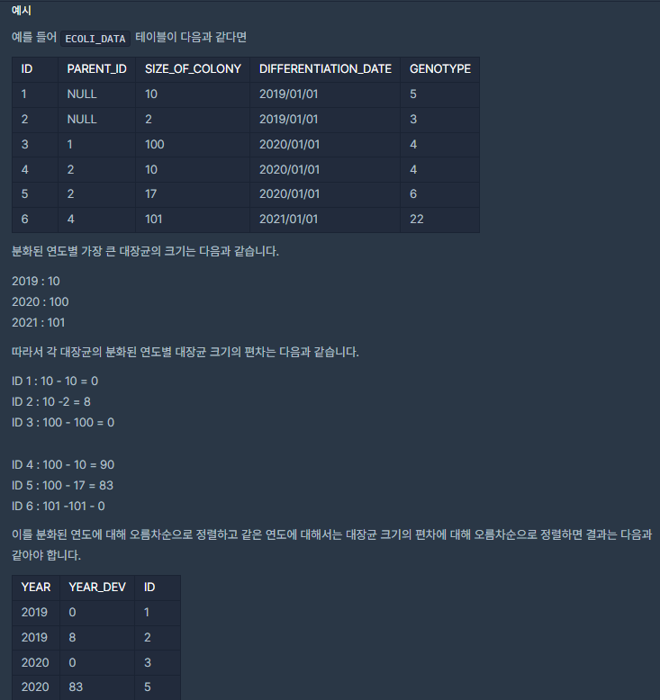 우선 YEAR_DEV 값은 YEAR_DEV = 연도별 가장 큰 대장균의 크기 - 각 대장균의 크기를 구하는 거다.