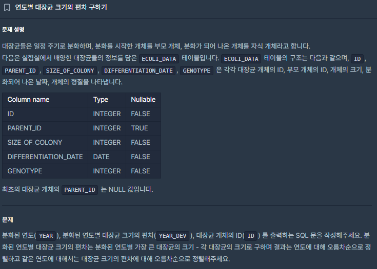 이번 문제는 프로그래머스 "연도별 대장균 크기의 편차 구하기" MySQL 문제다.