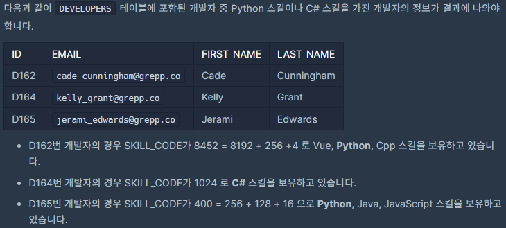 2. 이부분이 중요한데 WHERE 절을 사용해서 SKILL_CODE 값과 Python, C# 값들의 비트 연산 값을 비교해 주는 & 연산자를 사용해 준다. 비트 AND 연산을 사용해서 특정 언어가 포함되어있으면 0보다 큰 값이 리턴될 것이라는 점을 이용해 SKILL_CODE와 CODE를 비교한다. 이렇게만 해주면 끝이다..