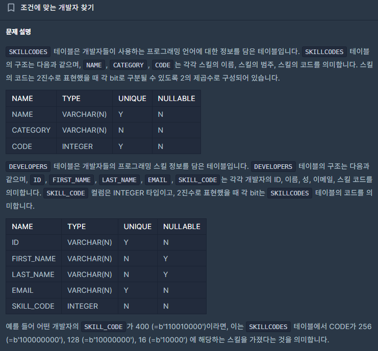 이번 문제는 프로그래머스 "조건에 맞는 개발자 찾기" MySQL 문제다.