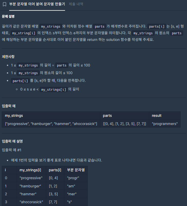 이번 문제는 프로그래머스 "부분 문자열 이어 붙여 문자열 만들기" 문제다.