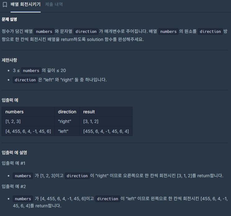 문제 접근은 direction이 "rigth"라면 numbers[] 값을 오른쪽으로 하나씩 이동시키고 "left"값이 라면 왼쪽으로 하나씩 이동시키는 문제다. 그럼 바로 풀이해보겠다.