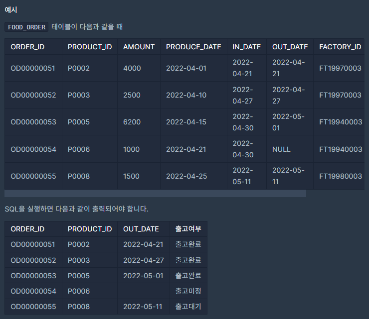 문제 접근은 OUT_DATE 값이 2022-05-01 이후이면 "출고대기", 이전이면 "출고완료" NULL값이라면 "출고미정"으로 "출고여부" 컬럼으로 보여주면 된다.