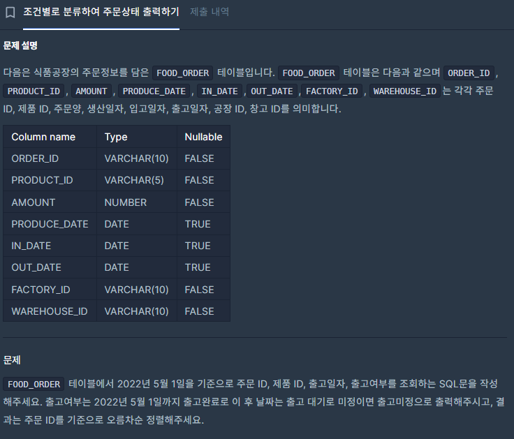 이번 문제는 프로그래머스 "조건별로 분류하여 주문상태 출력하기" MySQL문제다.