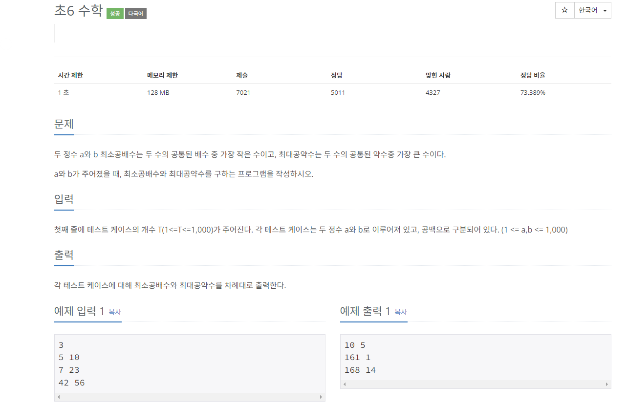 사실 크게 풀이 할게 없어 최대공약수와 최소 공배수만 구한다면 쉽게 풀 수 있어 꼭 한번 참고하는 걸 추천한다.