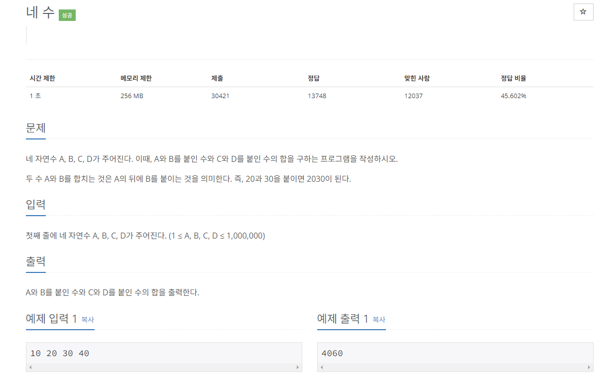 a, b, c, d 입력값이 주어지면 a, b를 앞뒤로 붙이고 c, d를 붙인 뒤 합을 구하는 문제다.